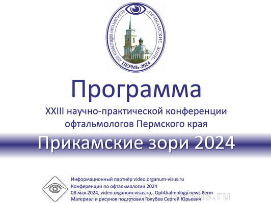 Прикамские зори 2024. ХXIII-я научно-практическая конференция офтальмологов Пермского края, 07 - 08 июня 2024 года, Пермь, Россия. Организатор кафедра офтальмологии ФГБОУ ВО ПГМУ им. академика Е.А. Вагнера Минздрава РФ. Conference of Ophthalmologists of the Perm 2024, Program eye conference. Информационный партнер портал Орган зрения video.organum-visus.ru