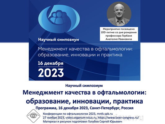 Менеджмент качества в офтальмологии 2023. Программа научного симпозиума офтальмологов в Санкт-Петербургском филиала МНТК Микрохирургия глаза Минздрава России, 16 декабря, Санкт-Петербург, Россия. Посвящена 100-летию профессора Горбаня Анатолия Ивановича. Quality management in ophthalmology 2023. Conference of ophthalmologists in St. Petersburg branch of NMRC IRTK Eye microsurgery. Program. Информационный партнер офтальмологический портал Орган зрения video.organum-visus.ru