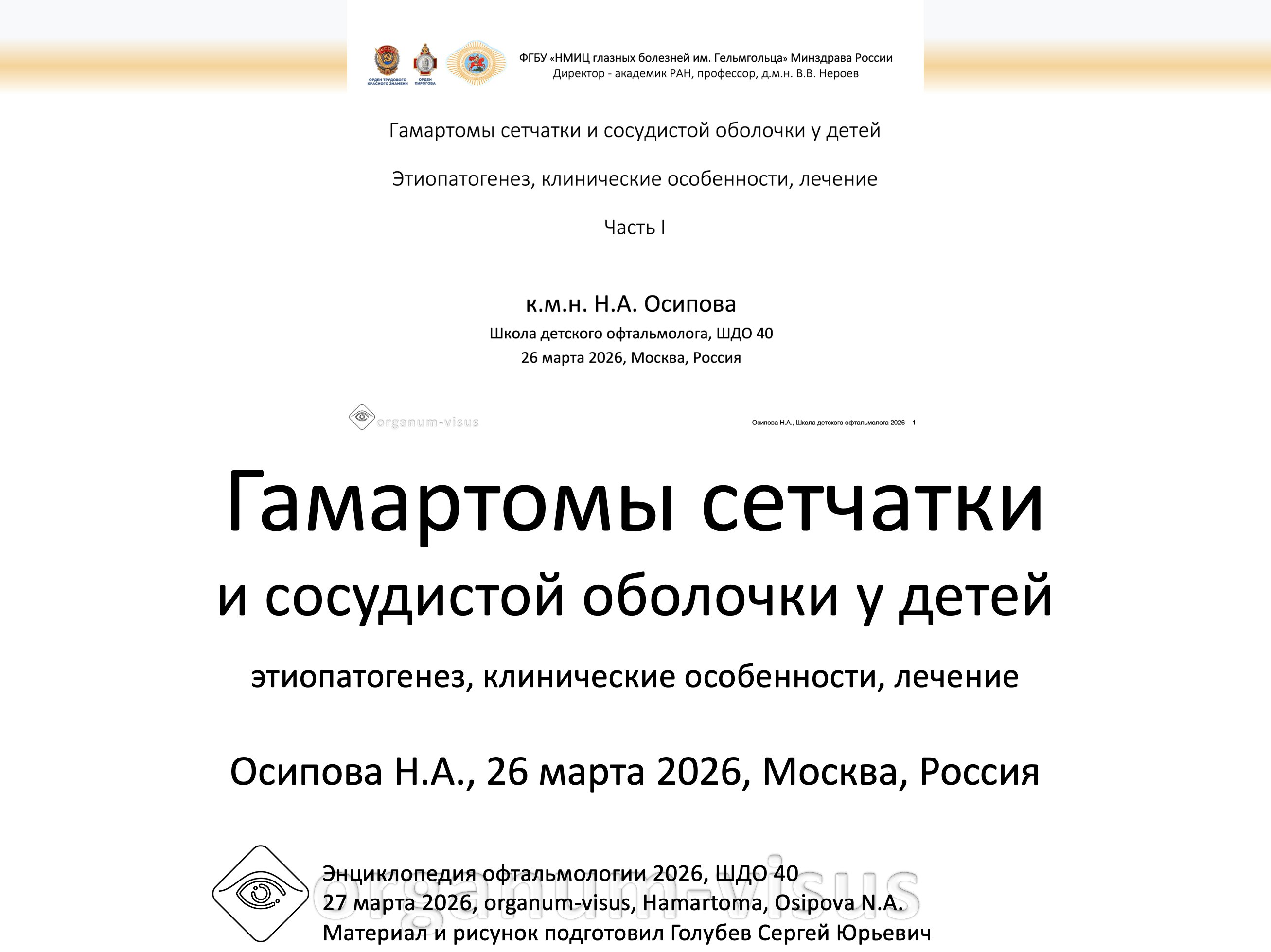 Гамартомы сетчатки и сосудистой оболочки у детей. Этиопатогенез, клинические особенности, лечение. Школа детского офтальмолога в НМИЦ ГБ им Гельмгольца, ШДО 40, 26 марта 2026, Москва, Россия. Secondary cataracts in children. Pediatric Ophthalmology School 40, Moscow, Russia. Информационный партнер электронное СМИ офтальмологический портал Орган зрения organum-visus