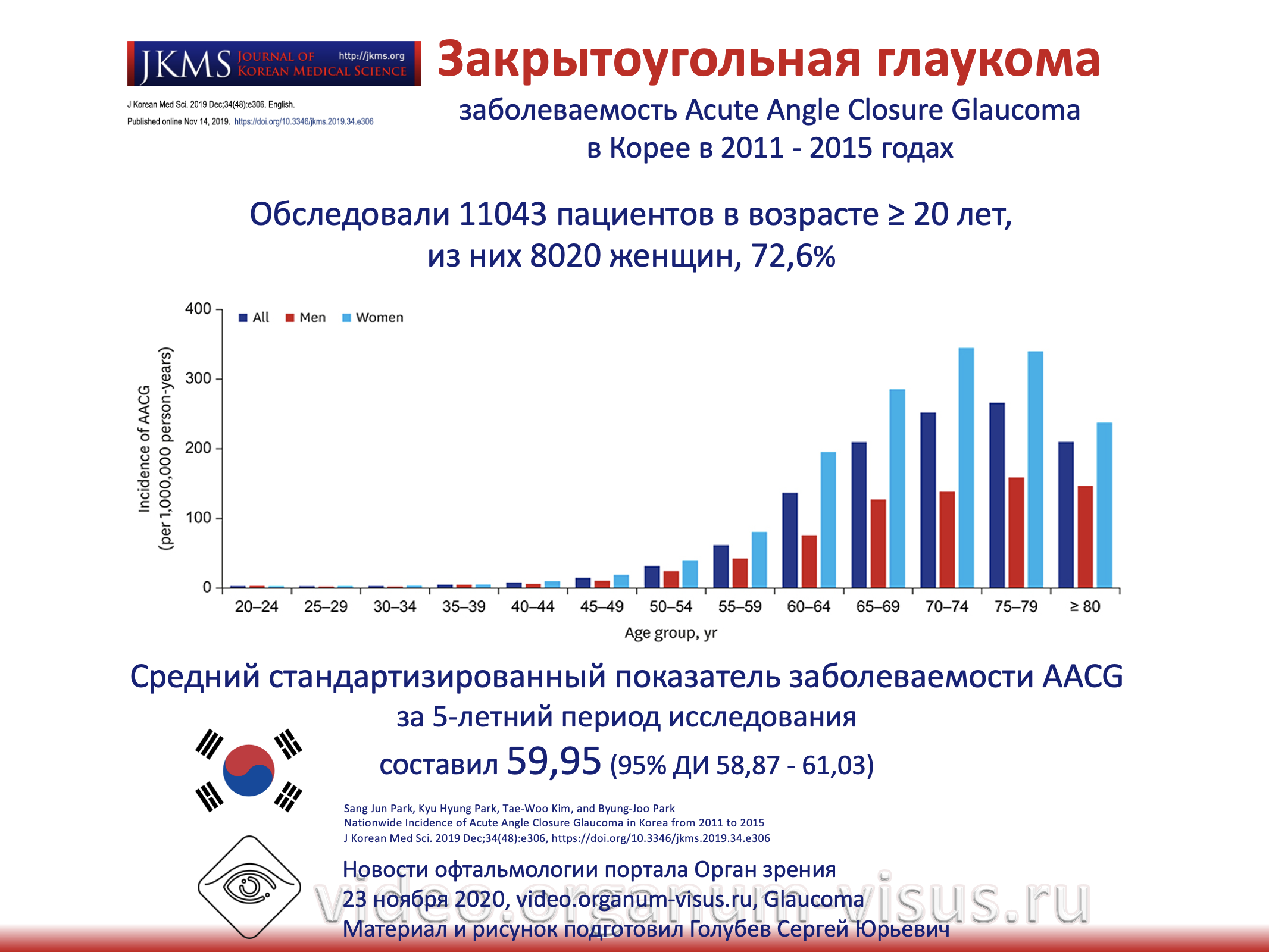 Авторы проанализировали данные 11043 пациентов с Acute Angle Closure Glaucoma, AACG, в возрасте ≥ 20 лет, из них 8020 женщин, 72,6%.