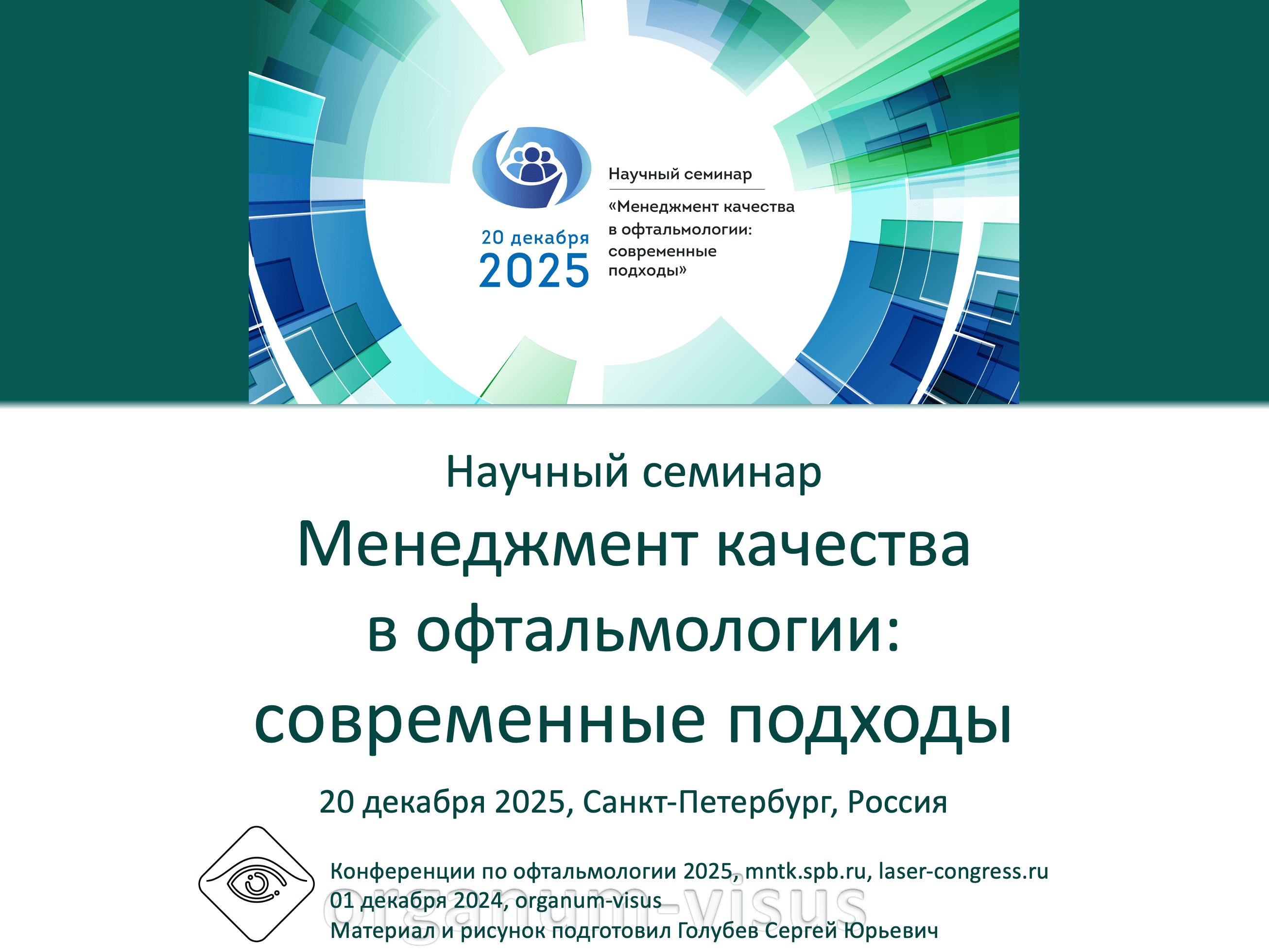 Менеджмент качества в офтальмологии 2024. Человекоцентричность и системное управление рисками. Симпозиум в Санкт-Петербургском филиале МНТК Микрохирургия глаза, 20 декабря 2024 года, СПб, Россия. Программа. Quality management in ophthalmology 2024. Human-centricity and systemic risk management. Can Do Scientific and practical symposium of ophthalmologists in St. Petersburg branch of NMRC IRTK Eye microsurgery. Информационный партнер офтальмологический портал Орган зрения video.organum-visus.ru