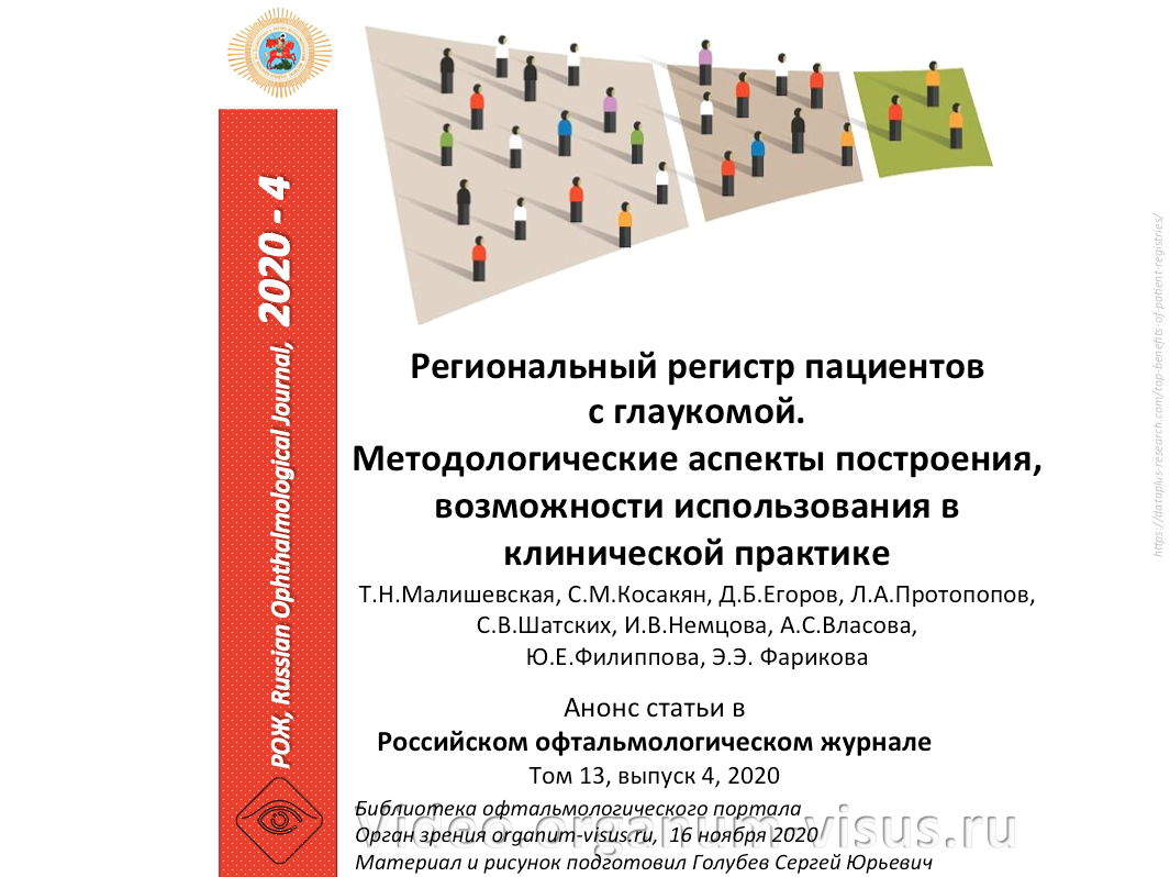 Малишевская Т.Н., Косакян С.М., Егоров Д.Б., Протопопов Л.А., Шатских С.В., Немцова И.В., Власова А.С., Филиппова Ю.Е., Фарикова Э.Э. Региональный регистр пациентов с глаукомой. Методологические аспекты построения, возможности использования в клинической практике. Российский офтальмологический журнал. 2020; 13(4 Приложение):