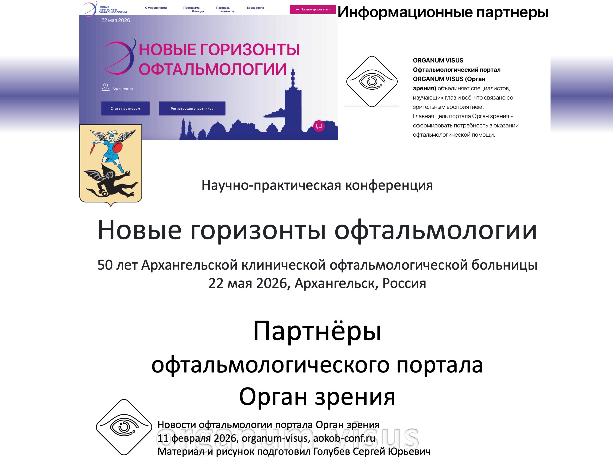 50 лет Архангельской клинической офтальмологической больнице. Анонс областной научно-практической конференции Новые горизонты офтальмологии, 22 мая 2026 года, Архангельск, Россия. 50th anniversary of the Arkhangelsk Clinical Ophthalmological Hospital. Announcement. Информационный партнер электронное СМИ офтальмологический портал Орган зрения organum-visus