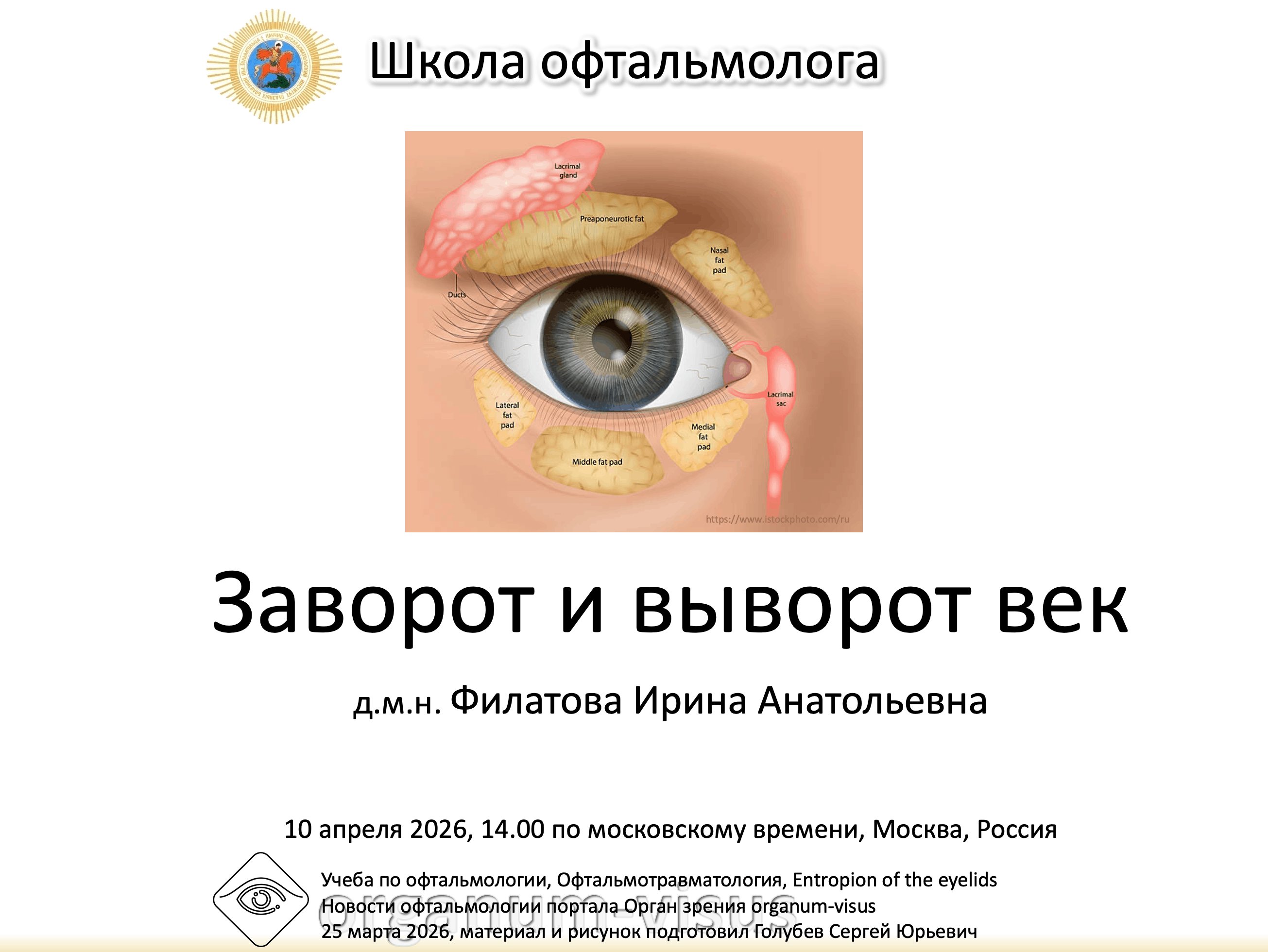 Наш опыт реконструктивных операций на веках при врожденных расщелинах лица. Разбор клинических случаев. Школа офтальмолога в НМИЦ ГБ им Гельмгольца, Москва, Россия, 11 апреля 2025 года, в 14.00 по московскому времени. Лектор Филатова Ирина Анатольевна, Руководитель отдела пластической хирургии и глазного протезирования. Our experience of reconstructive surgeries on eyelids for congenital facial clefts. Analysis of clinical cases. Информационный партнер электронное СМИ офтальмологический портал Орган зрения organum-visus