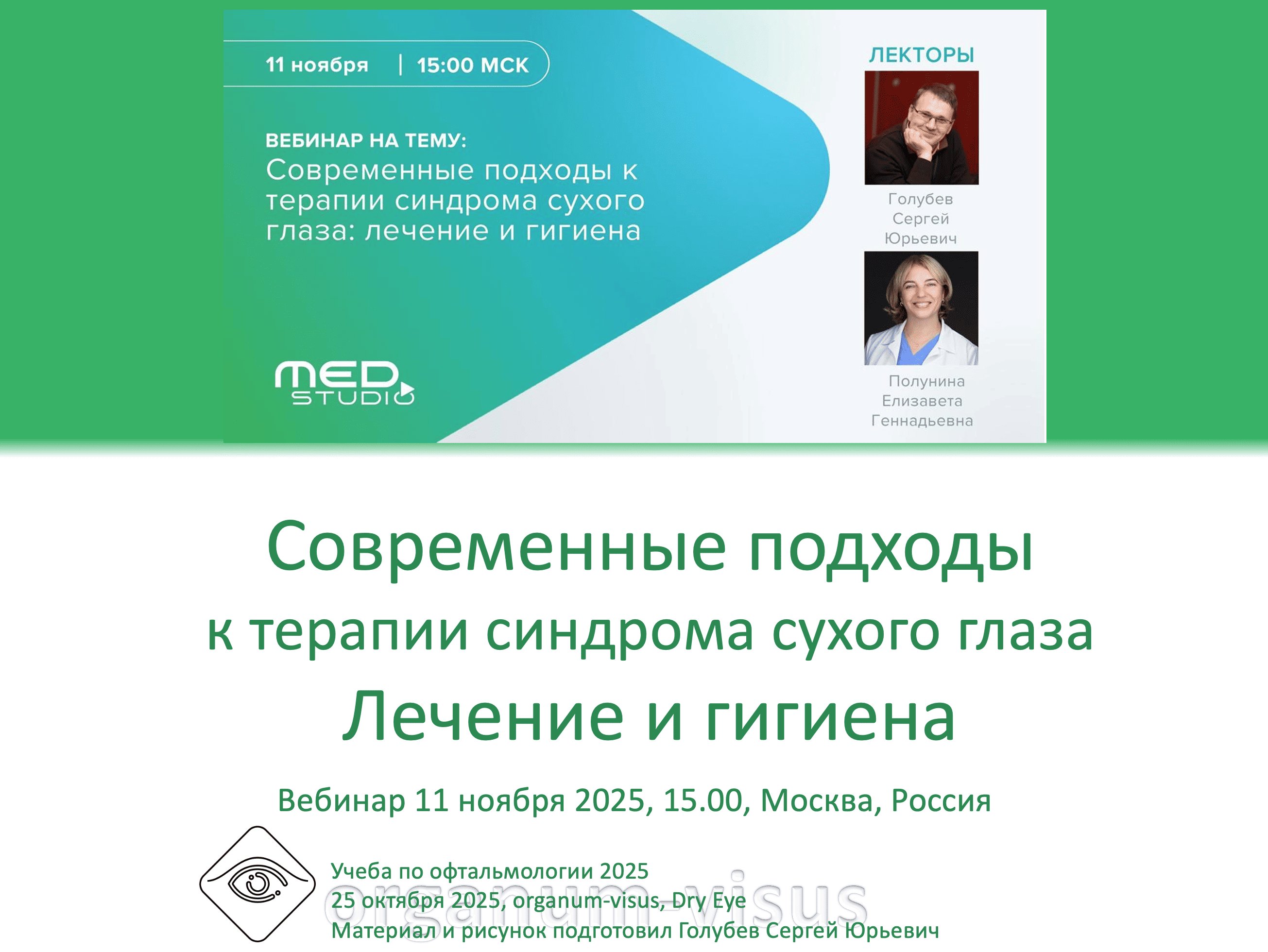 Чем заменить и как возобновить продукцию своей слезы? Первый вебинар цикла Тактика лечения офтальмологического пациента, 29 августа 2025 года. What to replace and how to renew the production of your tears? Совместный проект портала орган зрения и портала медицинского онлайн-образования MedStudio