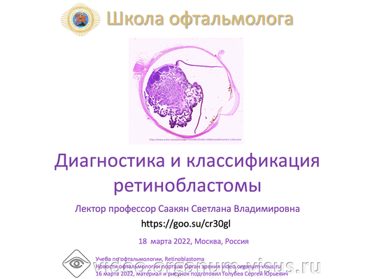 Школа офтальмолога. Диагностика и классификация ретинобластомы. НМИЦ ГБ им Гельмгольца, 18 марта 2022 года. Retinoblastoma. Лектор доктор медицинских наук, профессор Саакяна Светлана Владимировна. Информационный партнер офтальмологический портал Орган зрения.