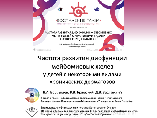 Дисфункция мейбомиевых желез у детей с дерматозами, В.А. Бобрышев В.В.Бржеский с соавт. Кафедра детской офтальмологии Санкт-Петербургского Государственного Педиатрического Медицинского Университета. Доклад на конференции Воспаление глаза 2023, Москва, Россия. The incidence of meibomian gland dysfunction in children with certain types of chronic dermatoses. V.A. Bobryshev, V.V. Brzhesky, D.V. Zaslavsky. Department of Pediatric Ophthalmology, St. Petersburg State Pediatric Medical University. Red eye. Энциклопедия офтальмологии портала Орган зрения, video.organum-visus.ru