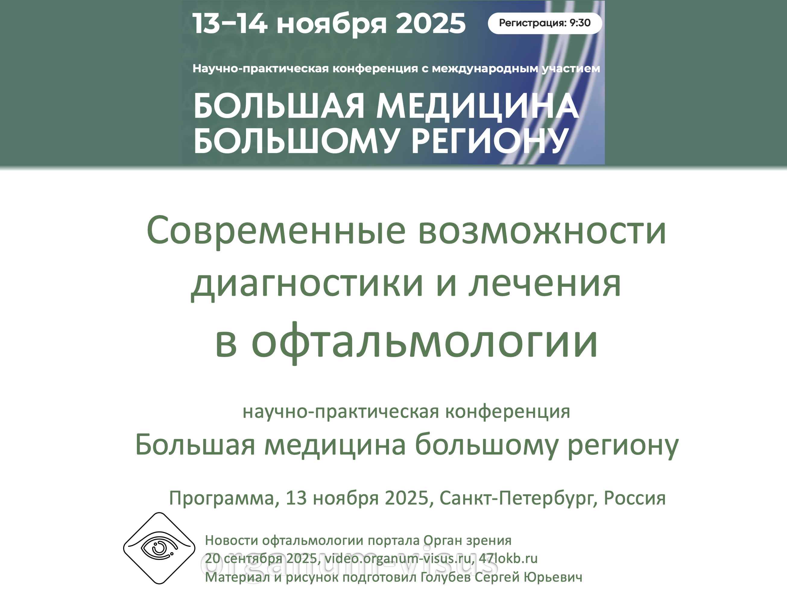 Новости офтальмологии. Большая медицина большому региону. Конференция в Санкт-Петербурге, 13-14 ноября 2025 года. Организатор Ленинградская областная клиническая больница. News eye. Big medicine for a big region. Информационный партнер электронное СМИ офтальмологический портал Орган зрения organum-visus
