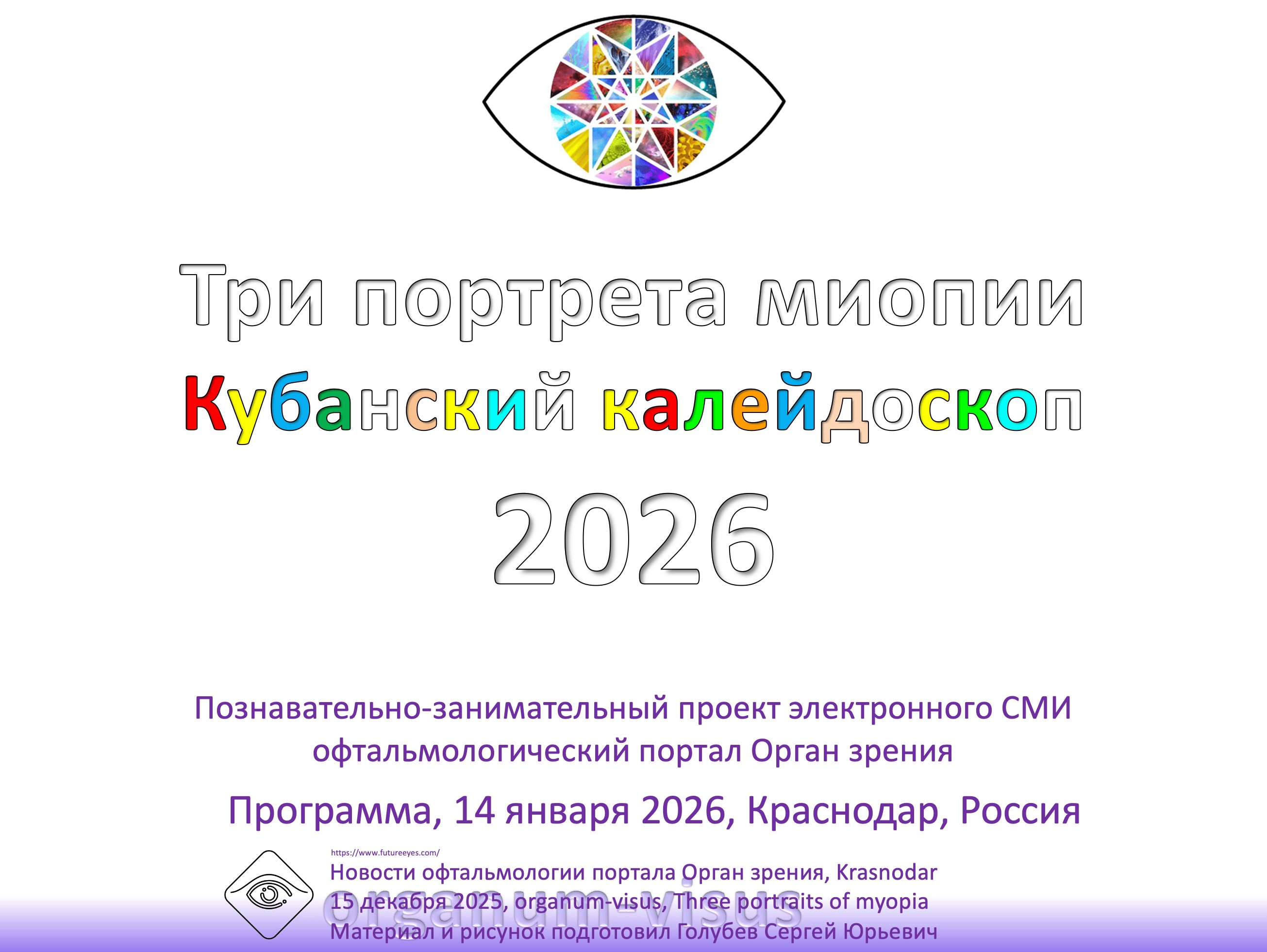 Познавательный проект портала Орган зрения Три портрета миопии. Кубанский калейдоскоп, Краснодар Россия, 26 января 2024 года. Программа конференции. Cognitive project of the portal organum-visus. Three portraits of myopia Kuban kaleidoscope 2024. Смотри Календарь конференций по офтальмологии на video.organum-visus.ru
