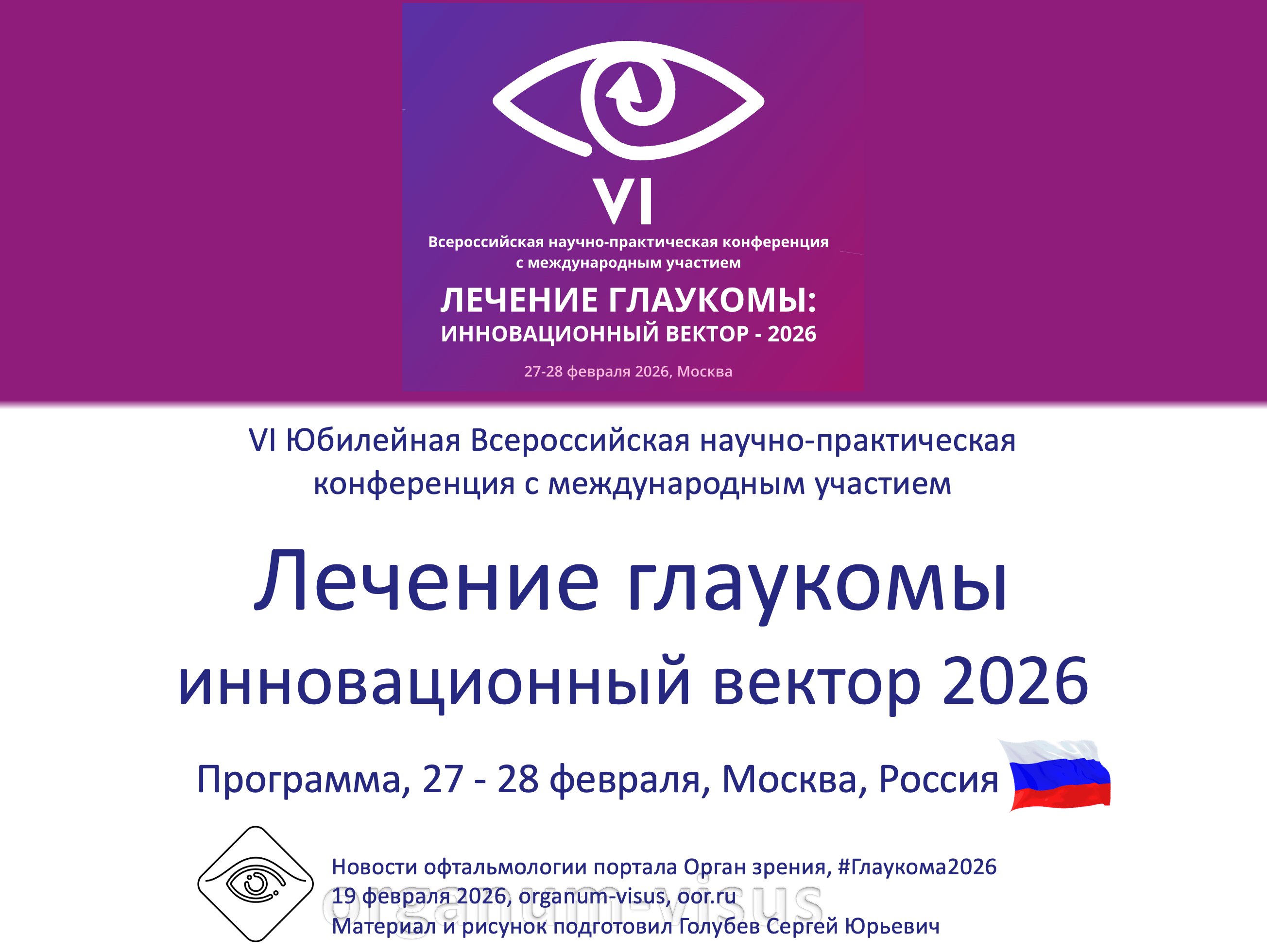 Лечение глаукомы. Инновационный вектор 2026. VI-я Юбилейная Всероссийская научно-практическая конференция с международным участием, 27-28 февраля 2026 года, Москва, Россия. Общество офтальмологов России, oor.ru, Treatment of glaucoma. Innovation vector 2026. Информационный партнер электронное СМИ офтальмологический портал Орган зрения organum-visus