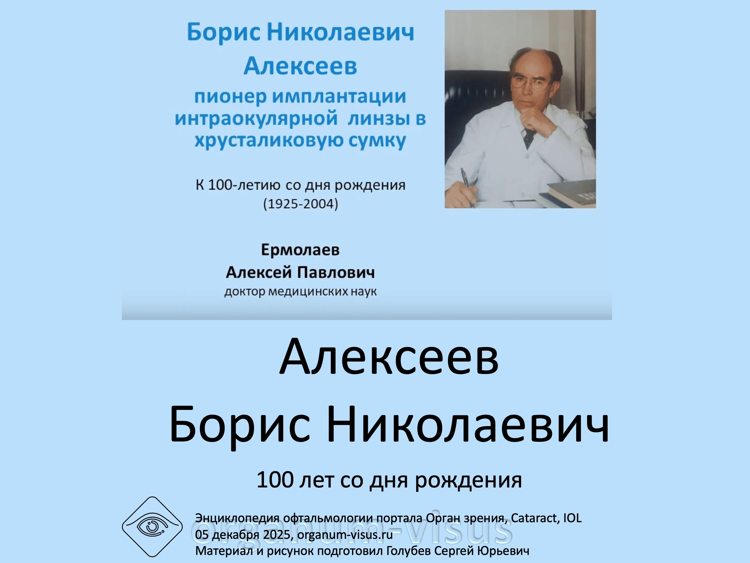 Профессор Алексеев Борис Николаевич 100 лет со дня рождения Первая в мире имплантация ИОЛ в хрусталиковую сумку