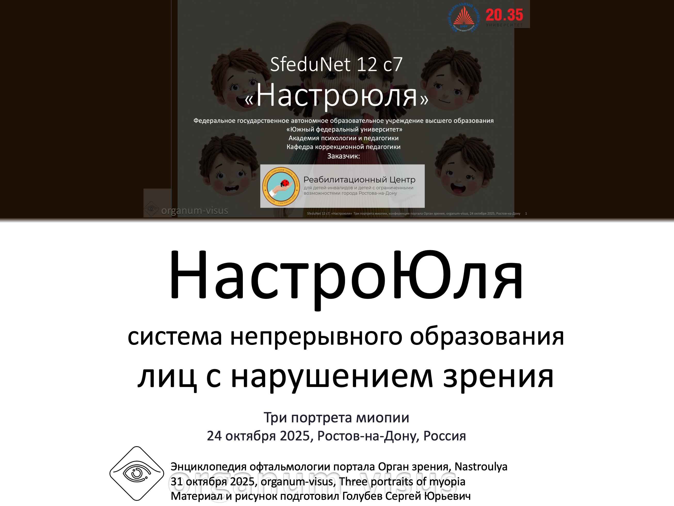Система непрерывного образования лиц с нарушением зрения. Доклад тифлопедагогов на конференции офтальмологов и неврологов Три портрета миопии. Конференция у «папы», Ростов-на-Дону, 24 октября 2025 года. Кафедра коррекционной педагогики АПП ЮФУ, МБ ДОУ 3 г. Батайска. System of continuous education for persons with visual impairments. Report of typhlopedagogic specialists. News about myopia. Three portraits of myopia. Новости о близорукости. Познавательный проект офтальмологического портала Орган зрения organum-visus