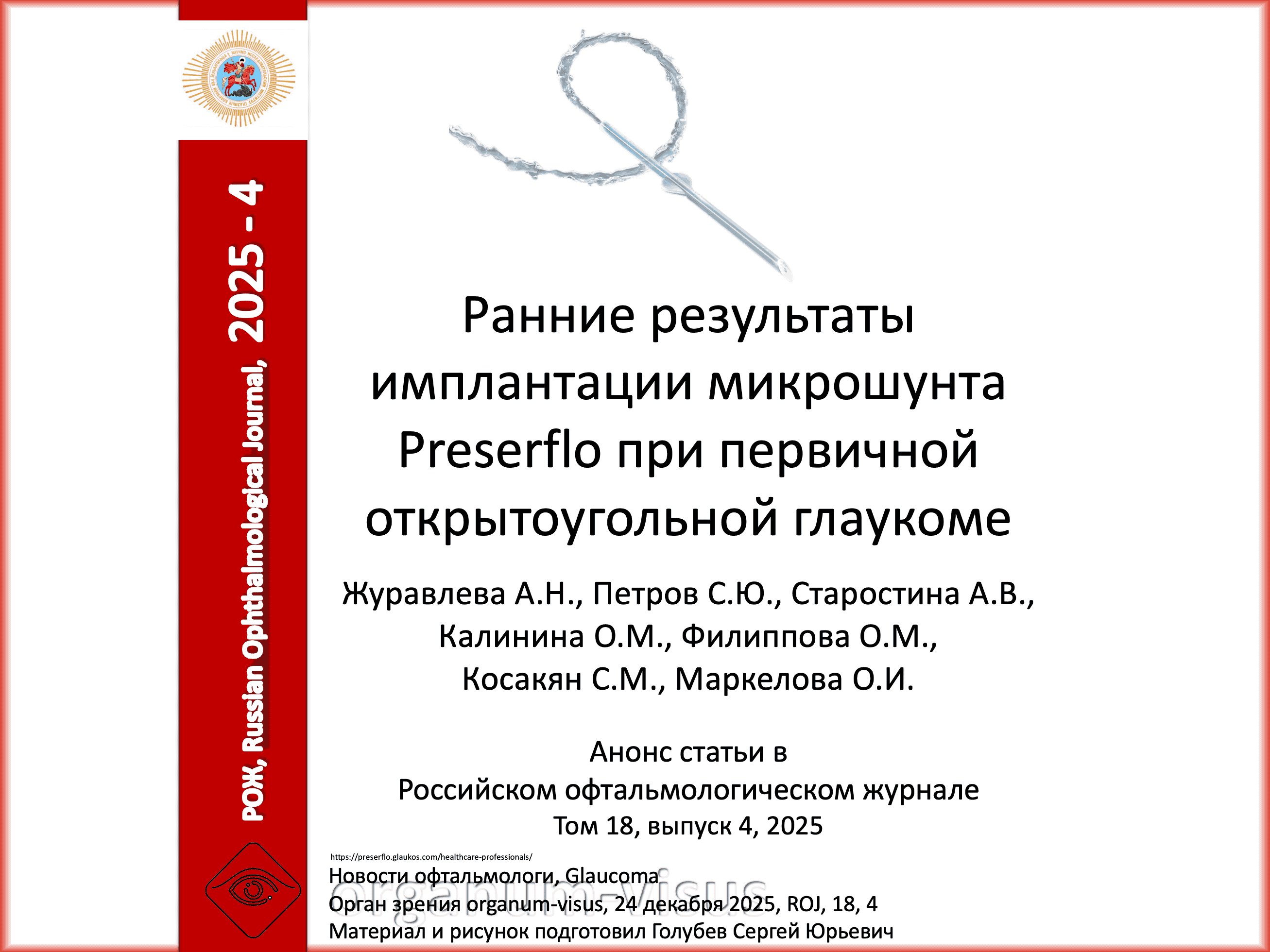 Для цитирования: Журавлева А.Н., Петров С.Ю., Старостина А.В., Калинина О.М., Филиппова О.М., Косакян С.М., Маркелова О.И. Ранние результаты имплантации микрошунта Preserflo при первичной открытоугольной глаукоме. Российский офтальмологический журнал; 2025; 18(4): 34-38