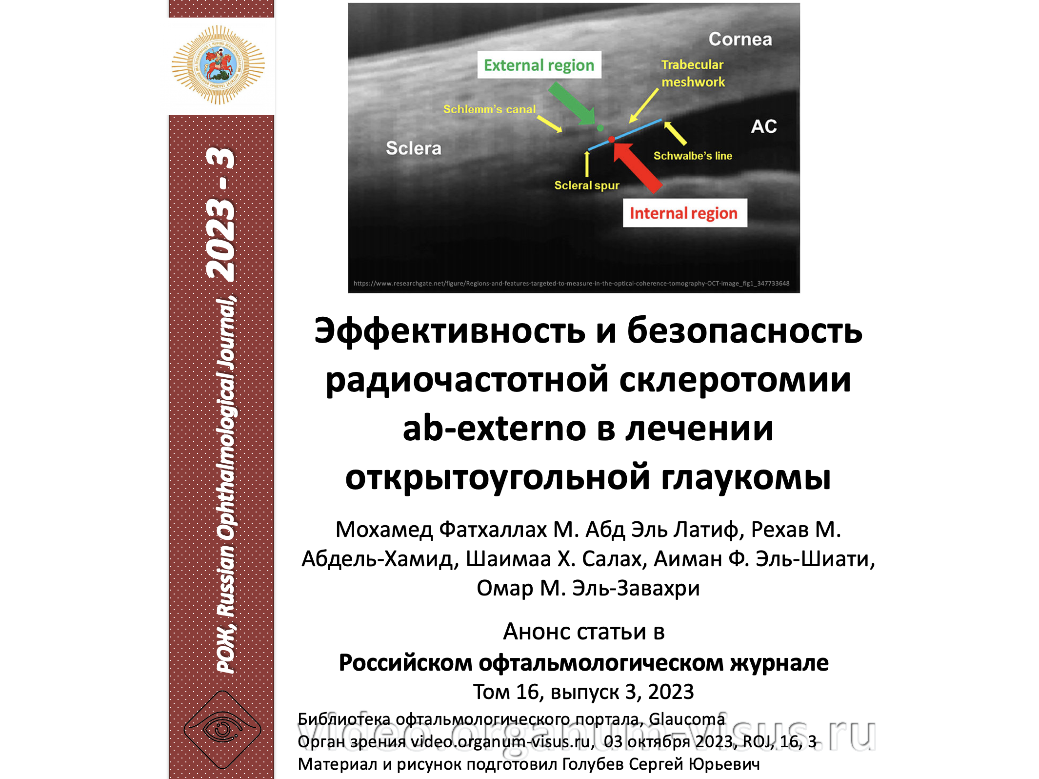 For citation: Fathallah M Abd El Latief, Abdel-Hamid RM, Salah SH, El-Shiaty AF, El-Zawahry OM. Efficacy and safety of ab-externo radiofrequency sclerostomy in management of open angle glaucoma Russian Ophthalmological Journal. 2023; 16(3):