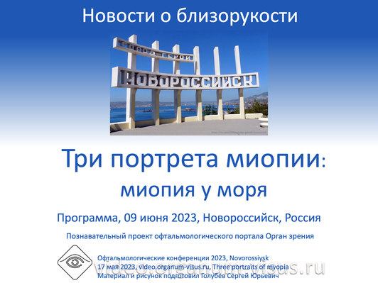 Новости о близорукости. Три портрета миопии в Новороссийске, Россия, 09 июня 2023 года. Познавательный проект офтальмологического портала Орган зрения video.organum-visus.ru в рамках Пленарного заседания Новороссийского Общества офтальмологов.Три портрета миопии. Миопия у моря. Программа конференции. Portal project Organum-visus. News about myopia. Three portraits of myopia in Novorossiysk, Myopia by the sea, Russia. Eye conference 2023.