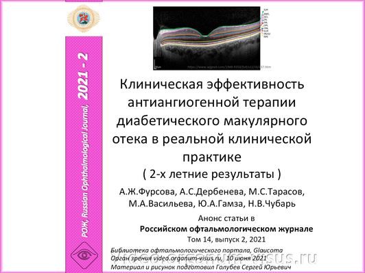 Клиническая эффективность антиангиогенной терапии диабетического макулярного отека в реальной клинической практике (2-х летние результаты), Clinical efficacy of antiangiogenic therapy for diabetic macular edema in real clinical practice (2-year results). Анонс статьи А.Ж.Фурсова, А.С.Дербенева, М.С.Тарасов, М.А.Васильева, Ю.А.Гамза, Н.В.Чубарь. Российский офтальмологический журнал, РОЖ, ROJ, 2021, выпуск 2.