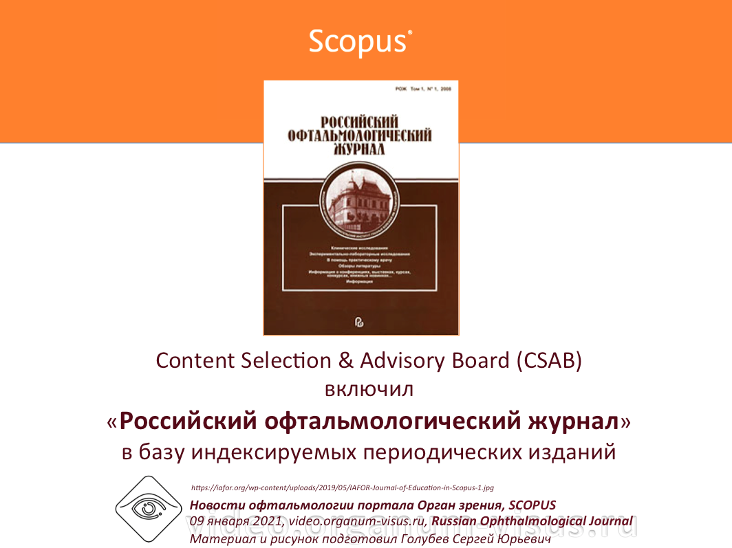 08 января 2021 года экспертный совет Scopus - Content Selection & Advisory Board (CSAB) - принял решение о включении «Российского офтальмологческого журнала» в базу индексируемых периодических изданий.