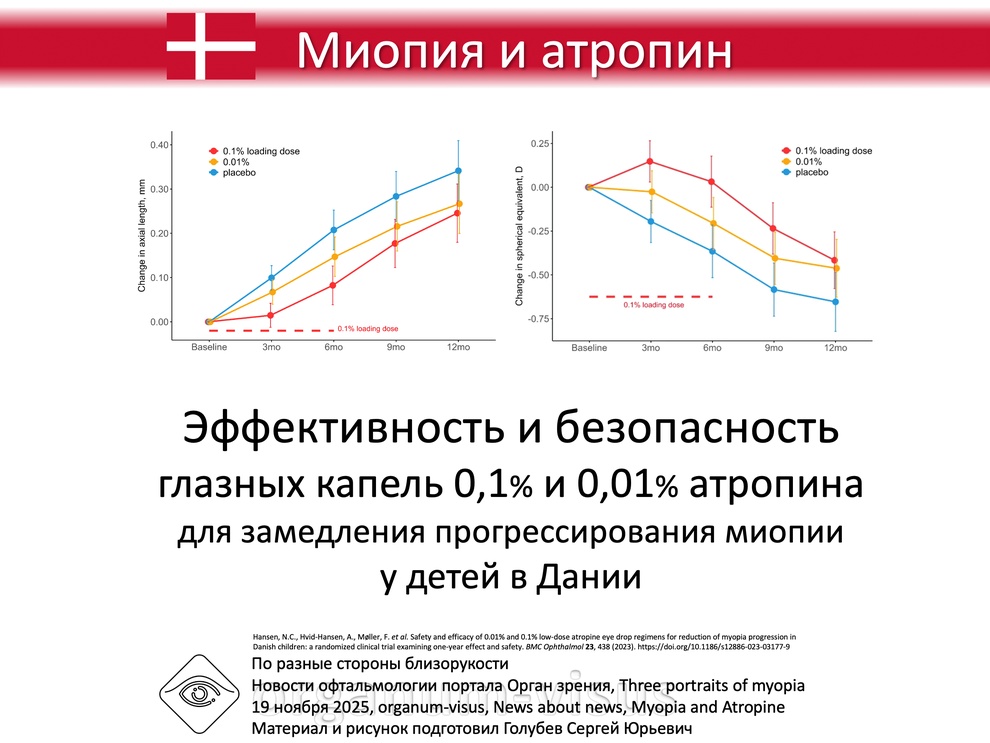 Hansen, N.C. et al изучили эффективность и безопасность глазных капель атропина низкой дозы 0,1% и 0,01% для замедления прогрессирования миопии у детей в Дании в рамках плацебо-контролируемого двойного слепого рандомизированного клинического исследования, которое сами и инициировали.