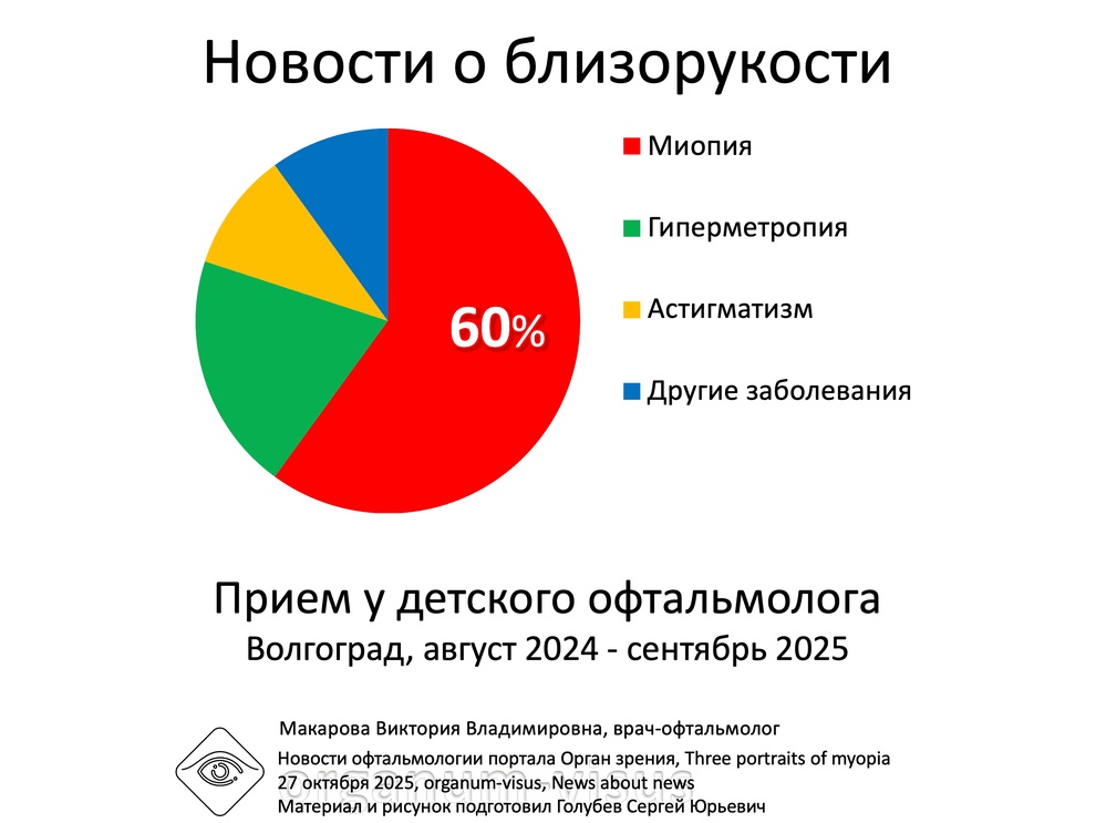 С августа 2024 года по сентябрь 2025 года на приеме офтальмолога в городе Волгограде преобладали миопы - 60%.